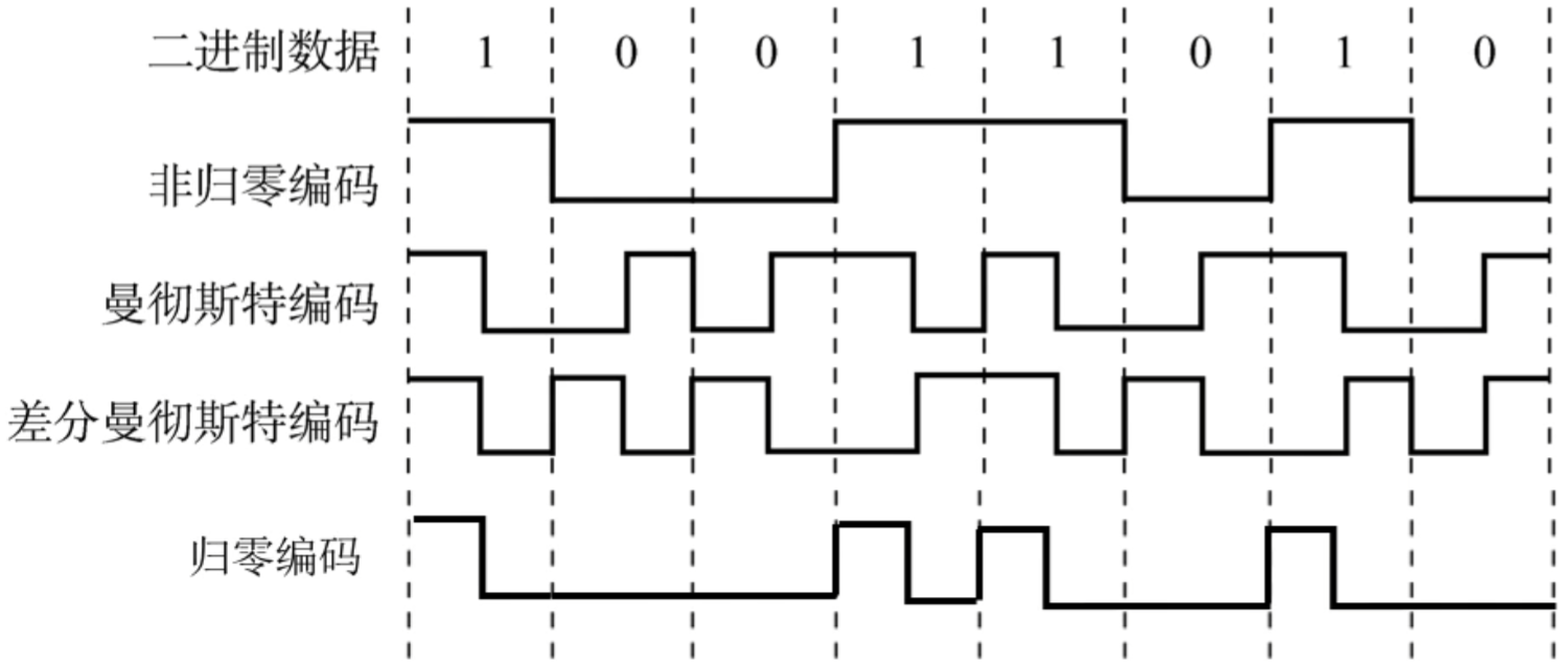 曼彻斯特编码:自同步,但是占用两倍宽度的频带,数据传输速率为调制速率的一半